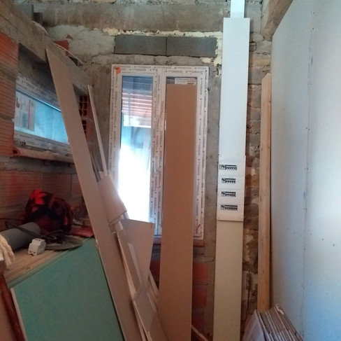 Pour Jean-Philippe, qui a des mains en or et qui a œuvré une bonne partie de sa vie dans le domaine du bâtiment (entre autres divers métiers) ce fut l'un des chantiers les plus compliqués à mettre en œuvre car nous n'avions pas d'aire de stockage et il nous a fallu déplacer maintes fois les différents matériaux (300 kg de sacs d'enduits, chaux, ciment, plaques de placo, montants et rails laissés sur place par le précédent propriétaire) d'un espace à un autre au fur et à mesure de l'avancement des travaux, en plus de ce que je stockais moi-même ça et là depuis mon emménagement. En d'autres termes, c'était un véritable bazar !